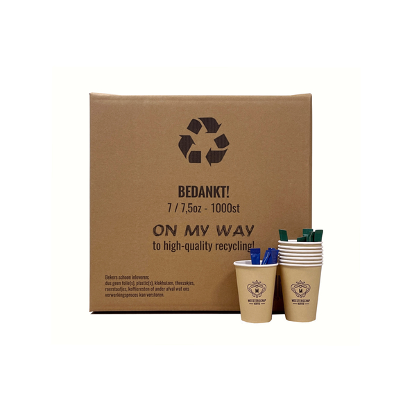 Recycle doos voor 1.000 koffiebekers 150-180cc inclusief rasters en zak per 10 dozen